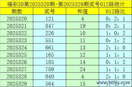 上期回归:福彩3D第2025329期开出奖号:564。奖号为组六款式,与试机号莫得同,奇偶比为1:2,大小比为2:1,012路比为1:1:1,和值为15,跨度为2。